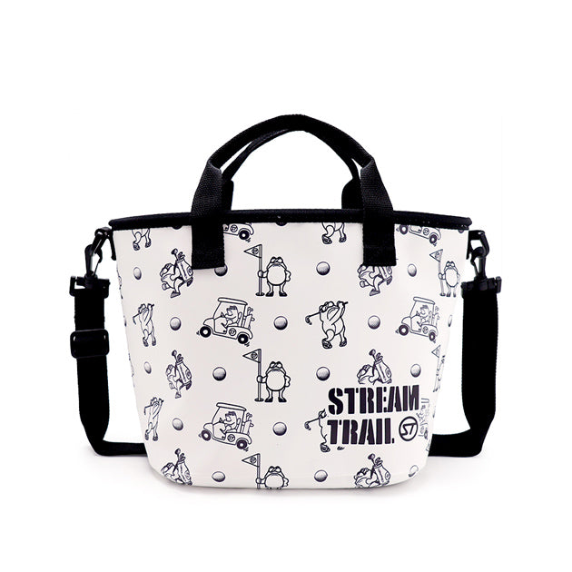 Stream Trailの人気モデル「PORGY MINI」に、待望の新カラーが登場しました。ブランドマスコットキャラクターDaveをモノグラム風にデザインした、遊び心あふれるシリーズです。 ゴルフラウンド中やちょっとした外出に必要なものだけをスマートに持ち運べるコンパクトサイズ。500mlペットボトルが縦に収まり、ファスナー付きフラップで安心の収納力を備えています。内側にはDカンとメッシュポケットを配置し、使い勝手も抜群。カラーはシックなONYX(ブラック)と爽やかなSPLASH(ホワイト)の2色展開。スタイリッシュなデザインと実用性を兼ね備えた、7Lサイズのミニバッグです。 |
