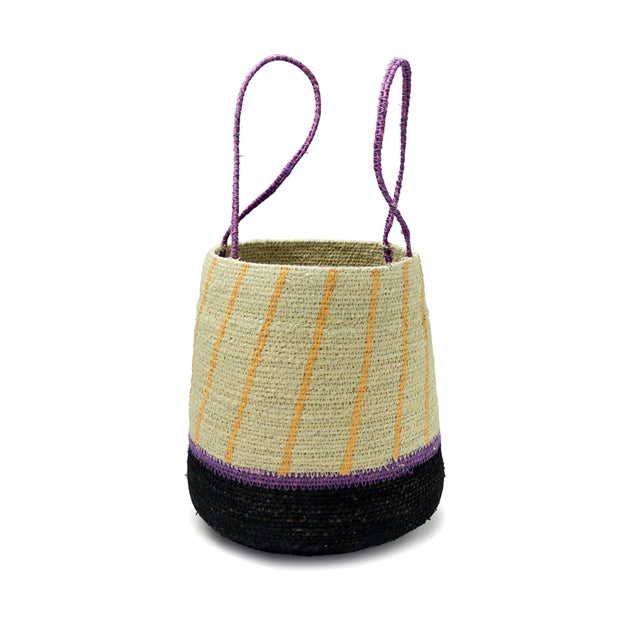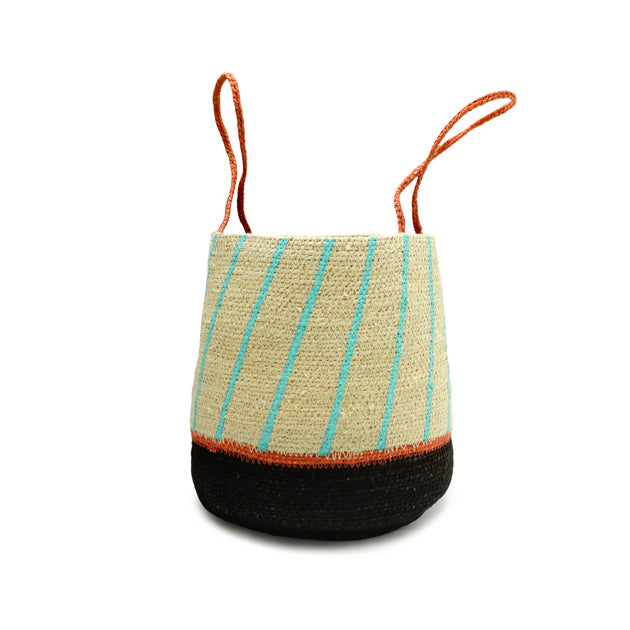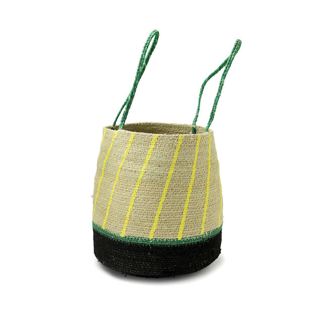 カラフルな持ち手とストライプが特徴的なバスケットです。小さめの観葉植物の鉢カバーや、リモコンなどを収納する小物入れにも最適です。 シーグラス(ウォーター・ヒヤシンスやシーグラスラタンとも呼ばれる天然素材)は、しなやかで丈夫な特性を持ち、通気性に優れています。インドの手工芸の街モラダバードの職人が丁寧に編み込んだハンドメイドクラフト品です。 |