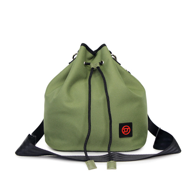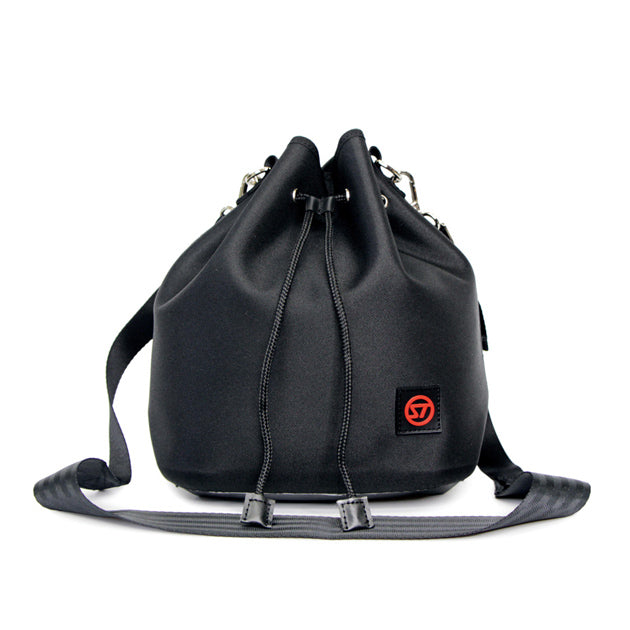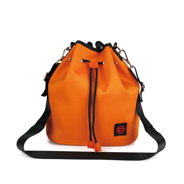 縫い目にシーリング加工を施し、防水性を備えた巾着タイプのバッグです。開口部を絞る少し太めのコードがアクセントになり、本体も目を引くカラー、デザインとなっています。ショルダーストラップは、ご自身でフィットする長さに調整してお使いいただけます。街中はもちろん、海やプールサイドなどの水辺のシーンでも重宝します。容量3.5L。取り外し可能なインナーポシェットが付いています。