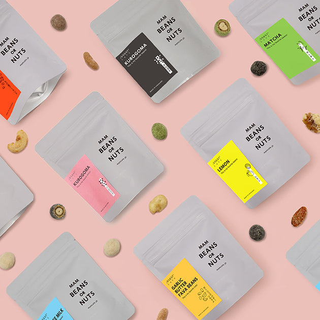 昔ながらの豆菓子を現代風にアレンジした豆菓子とミックスナッツ、「MAM BEANS or NUTS」。豆は、どんなところでもよく芽を出し多くの実をつけ、食べれば栄養豊富、と古来から人々に幸をもたらす縁起の良い食べ物と言われていて、結婚式などのハレノヒではお客さんに振舞われたものです。MAM BEANS or NUTSは日本では昔から馴染み深い豆菓子やナッツをレモンやコーヒー、ガーリックバターなどちょっと変わった味にアレンジし、パッケージもスタンドパウチの食べやすいタイプにすることで、豆菓子から縁遠かった方にも興味を持ってもらえるようにした商品です。